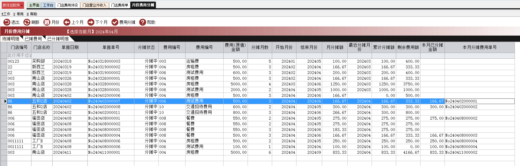 - 已分摊明细:用于记录当月已分摊生成门店费用单明细
