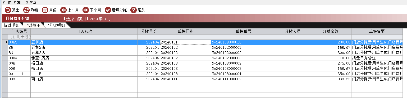 - 待摊明细:显示所有门店分摊费用单