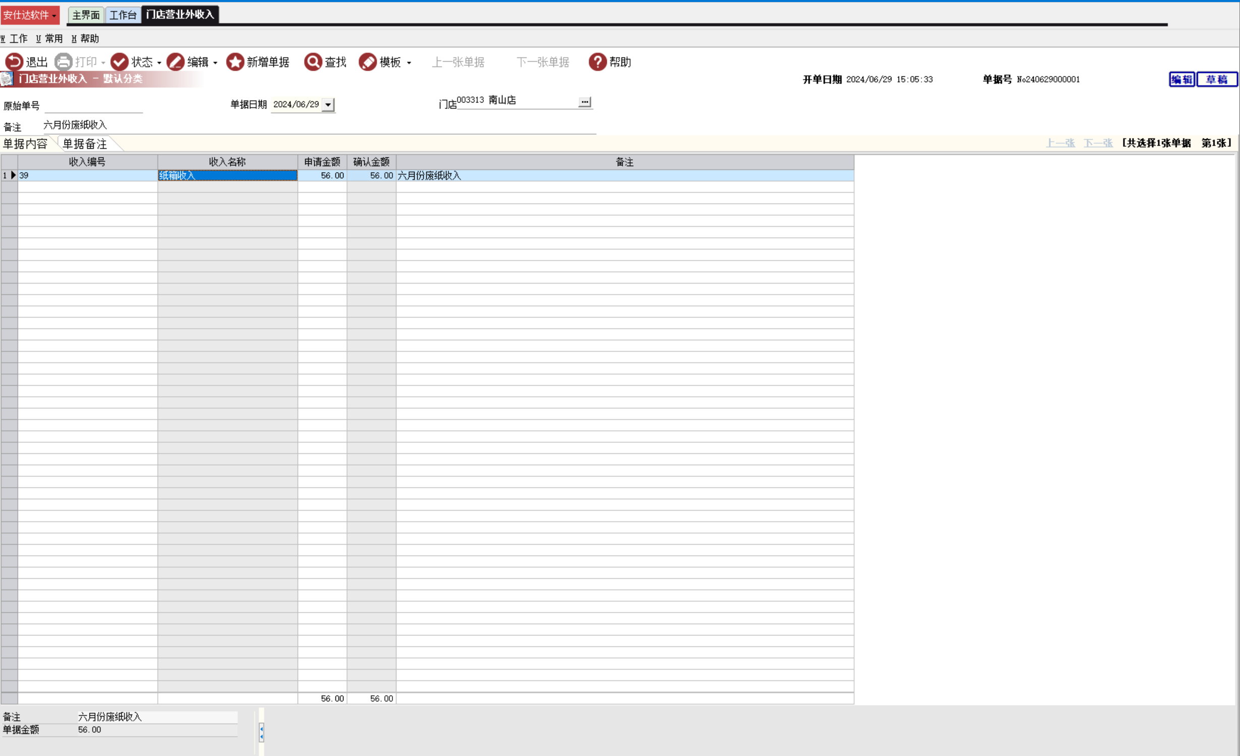 安仕达软件 发布时间: 2024-12-31 门店营业外收入 一、功能简介用于做营业外收入单据二、功能路径财务管理-->门店利润-->门店营业外收入 三、功能详情 操作流程:1、新增单据2、录入单据备注3、录入费用项目4、填写项目金额5、点状态,点审核; 提交反馈 上一页 门店营业外收入确认 下一页 月度费用分摊